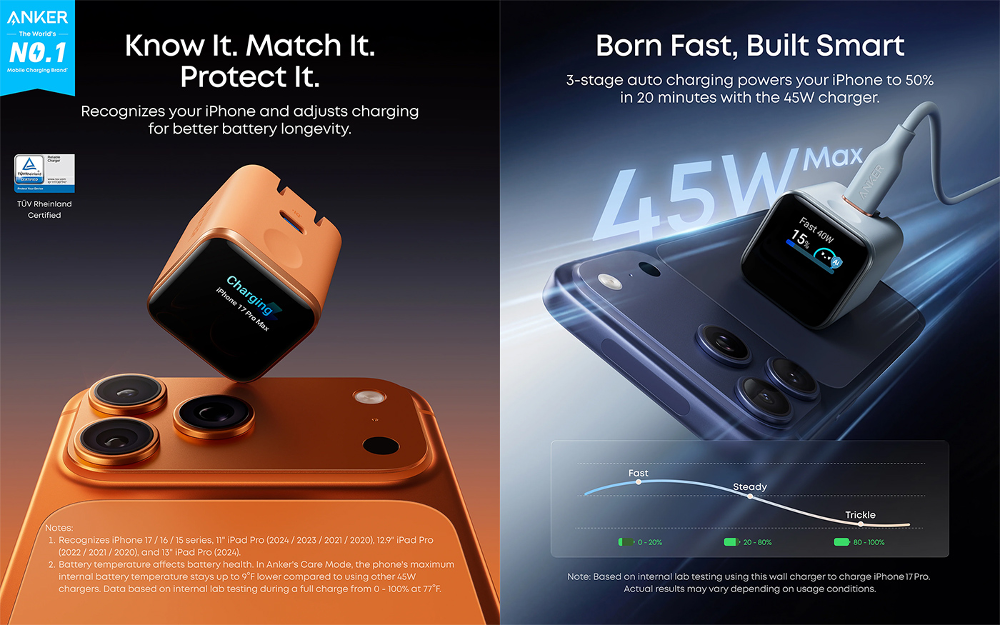 O Anker Nano Charger with Smart Display é capaz de fornecer até 45 W de potência de carregamento com ajuste inteligente de potência em três etapas (Fast, Steady e Trickle) para se adaptar às necessidades do dispositivo. Conta com tecnologia GaN (nitreto de gálio) com mais de 10 milhões de verificações diárias de temperatura com almofadas e pasta térmica para uma gestão térmica super eficaz.