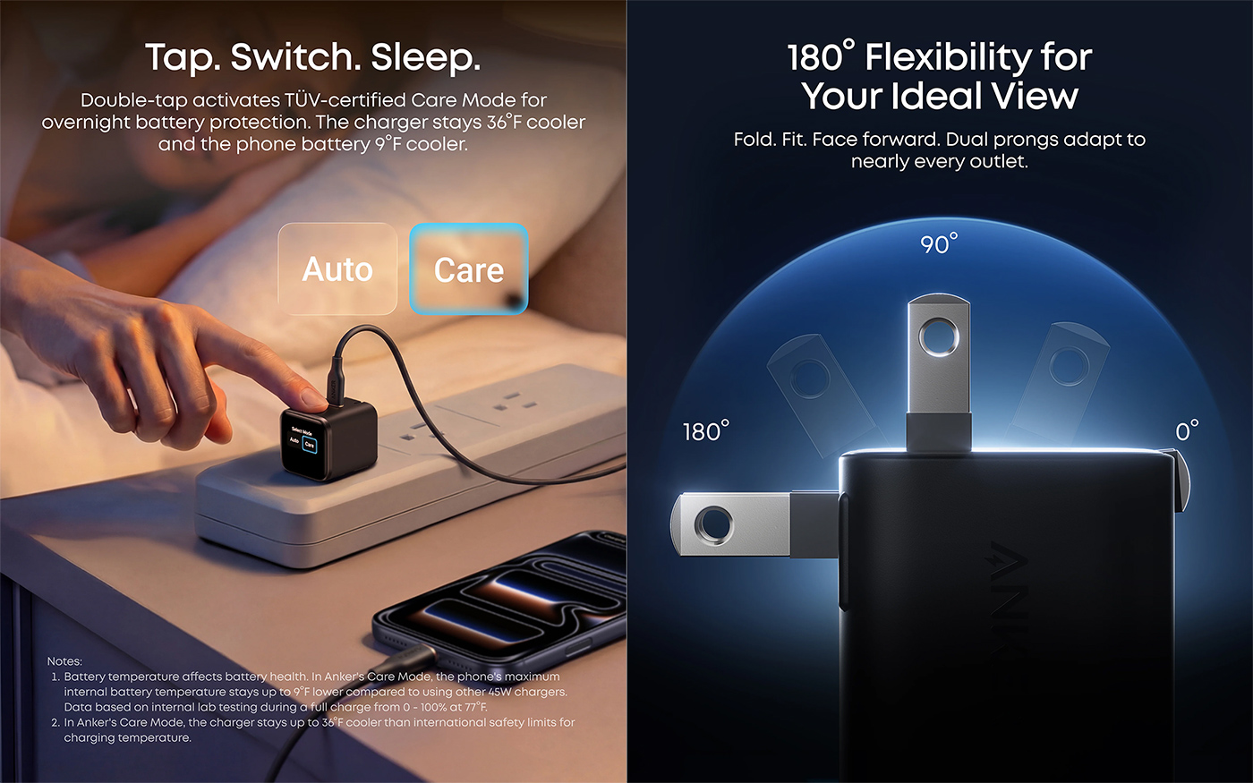 Além disso, ele possui o modo Care, certificado pela TÜV, que mantém a temperatura interna da bateria do telefone mais baixa que outros carregadores de 45W e do próprio carregador até 2°C abaixo dos limites internacionais de segurança, ajudando a prolongar a vida útil da bateria.