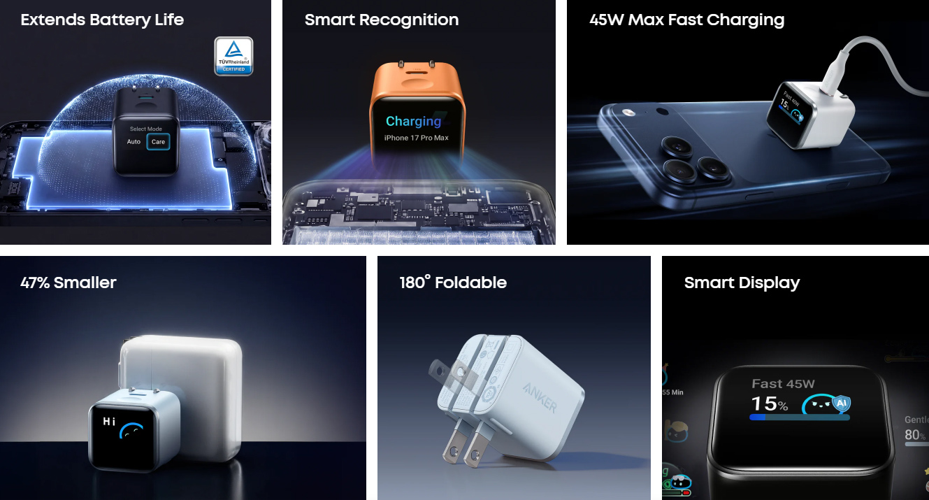 O Anker Nano Charger with Smart Display (45W – 180° Foldable) possui um display inteligente com mais de 20 interfaces que mostram em tempo real informações úteis como potência, temperatura e status de carregamento, além de várias animações divertidas e dados visuais, para ajudar o usuário a acompanhar o processo de carga. O display é controlado por toques no topo do aparelho.